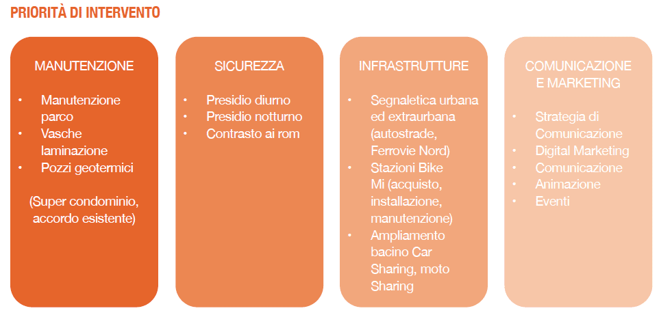 Il Budget di spesa complessivo del Bid Cascina Merlata Partnership è stato di 592.018 euro nel 2018 e 350.000 euro nel 2019 e le priorità di intervento sono rappresentate nello schema grafico.