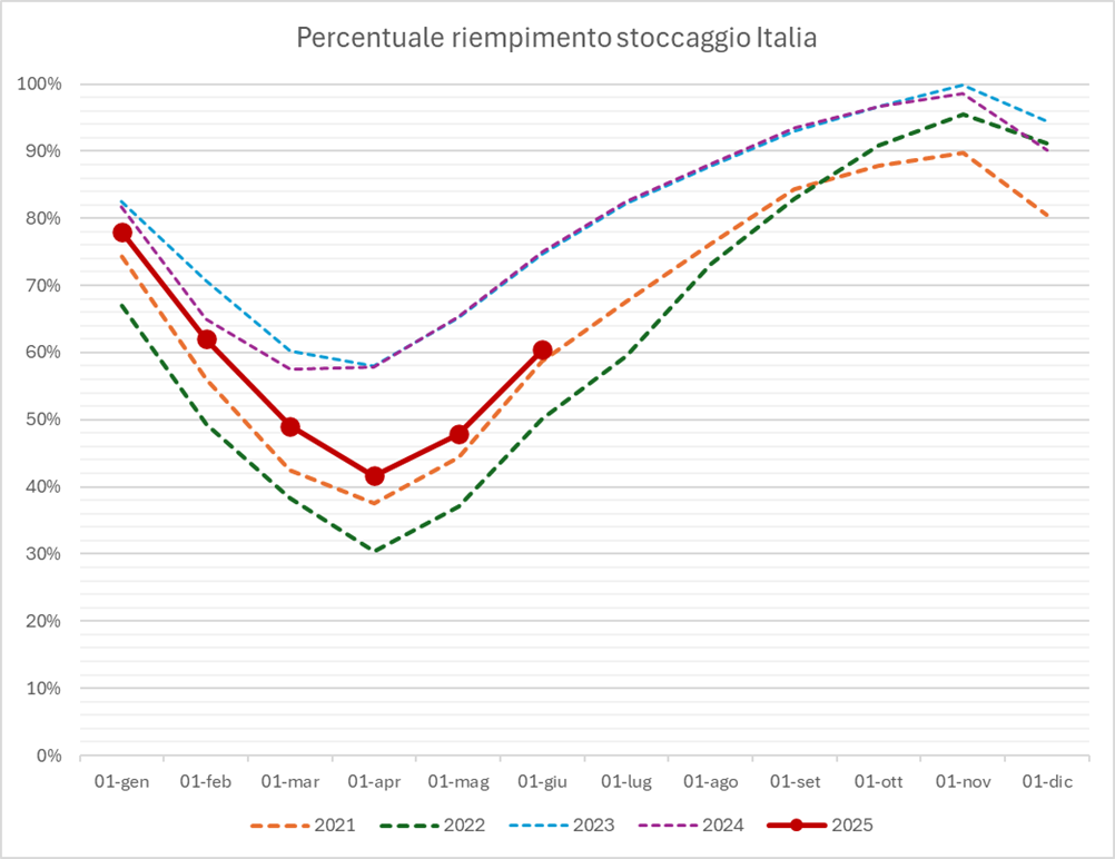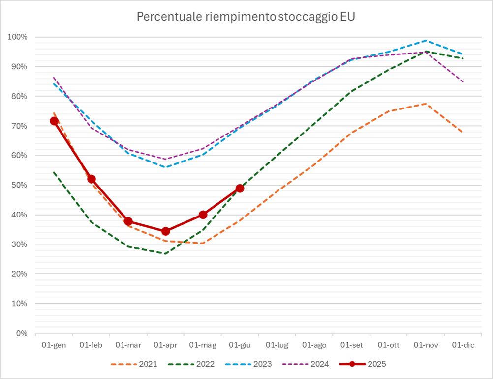 - I grafici relativi all’andamento dello stoccaggio in Italia e in Europa nel suo complesso.