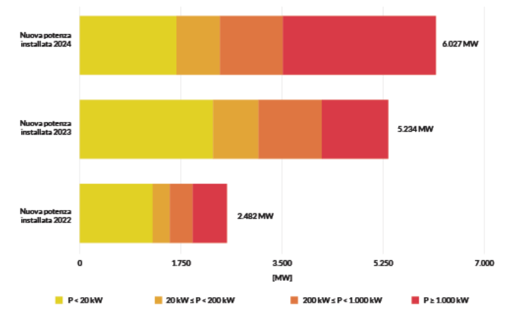 Lo scorso anno gli impianti con potenza superiore a 1 Mw hanno contribuito a oltre il 43% della nuova potenza, quasi il doppio rispetto all’anno precedente, riflettendo un contesto regolatorio e finanziario che favorisce la realizzazione di impianti di taglia medio-grande.