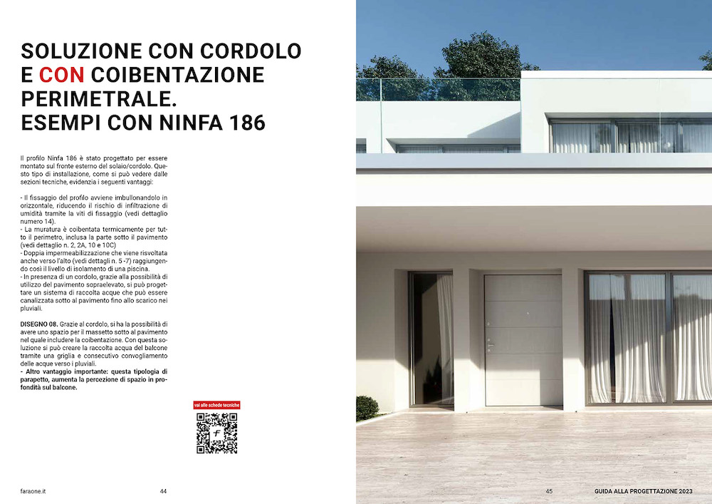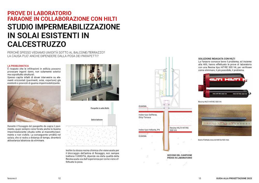 60 disegni tecnici, disponibili in formato PDF e DWG, e tante informazioni tecniche e pratiche per i progettisti. La “Guida alla progettazione dei parapetti in vetro“ di Faraone si presenta come una preziosa risorsa per i professionisti che devono progettare parapetti in vetro, un’opera completa che copre tutti gli aspetti, dalla coibentazione termica del balcone alla corretta posa in opera e fissaggio in sicurezza su balconi e terrazzi.