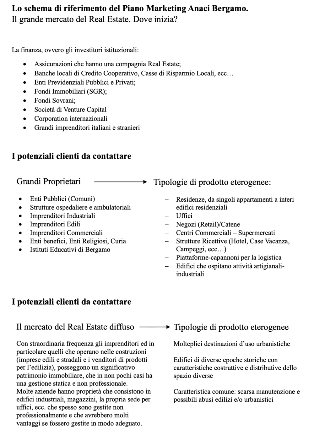 Obiettivo del piano Mmarketing di Anaci Bergamo è l’individuazione dei soggetti potenzialmente interessati alla nuova gamma di servizi offerti dalle società del real estate, in una fase storica nella quale le nuove normative energetiche e ambientali e la prospettiva della transizione verso il Green Deal europeo determinano una accelerazione dei processi di obsolescenza degli edifici e dei patrimoni immobiliari di tutti i proprietari, che non hanno attivato una gestione dinamica del patrimonio immobiliare.