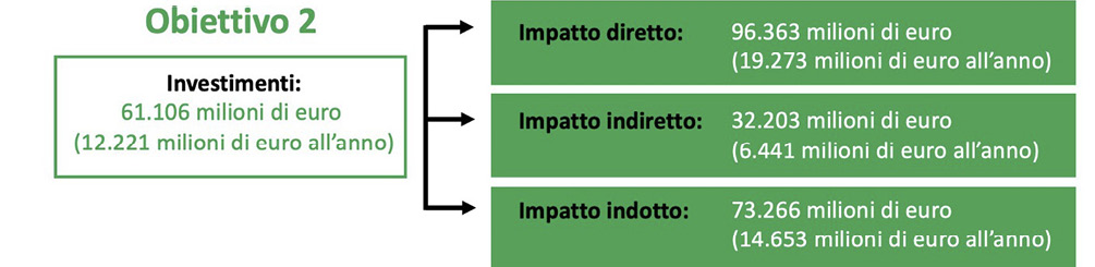 Per giungere a tale obiettivo, l’analisi del Centro Studi Fondazione Geometri Italiani ha calcolato la necessità di produrre interventi per complessivi 84,8 miliardi di euro di investimenti, equivalenti ad una media annua di oltre 14,1 miliardi di euro l’anno, che se attivati genereranno un impatto diretto sul settore delle costruzioni e relativi fornitori pari a 133 miliardi di euro, un impatto indiretto di 45 miliardi di euro e un impatto indotto di ulteriori 102 miliardi di euro, con un moltiplicatore pari a 3,3: investendo 1 miliardo di euro in rigenerazione energetica delle abitazioni si generano 3,3 miliardi di impatti economici tra impatti diretti, indiretti e indotti.