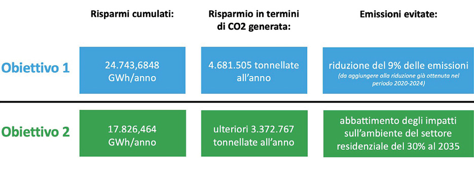 Obiettivo di lungo periodo è arrivare alla decarbonizzazione totale nel 2050. Dal 2020 al 2024, grazie agli incentivi fiscali legati alle detrazioni per il superbonus 110% e alle altre detrazioni, l’Italia ha ottenuto un risparmio in termini di consumi evitati di circa 32.300 GWH/anno, valore che se rapportato ai consumi rilevati nel 2020 evidenzia come si sia già raggiunto il 9,1% dell’obiettivo prefissato al 2030.