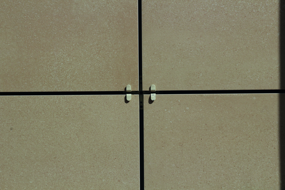 Le lastre in grès di grande formato 60×120 cm, scelte nel colore sabbia naturale, sono state fissate meccanicamente ai correntini metallici di Isotec Parete mediante staffe, con morsetti a vista in tinta, eliminando così definitivamente il rischio di distacchi accidentali.
